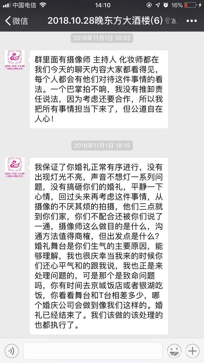 下午布置晚上婚姻场景的时候,最最最奇葩的事情来了,站台具体比走台矮了30cm,当时因为累,在老婆试装的房间眯了会儿,出来的时候下午4点出点头,老人在那急的团团转,我和婚庆的工作人员沟通,他们负责搭台子的那个胖胖的男的,嬉皮笑脸的跟我说,这个跟他们没关系,台子就是这么搭的,你爱找谁找谁,这是和他没关系,第一时间我打了老板梁涛的电话,不接,一遍一遍的打就是不接,后来去酒店前台拿了他们的名片,打了上面的座机,尾号520的那个,居然不是他家的,人家是另外一家婚庆公司的号码,我勒个去,要吐血了,没有固话,装什么门面呢?时间紧迫,我去找了酒店的大堂,酒店说这是婚庆的问题,酒店打婚庆老板梁涛的电话,梁涛接了,说会处理。等到5点多的时候事情还没解决,我老婆化完妆出来看着还是一片狼藉,发飙了,说弄不好今天,酒店和婚庆公司都别想开了,也许是这样酒店和婚庆才开始慌了吧,后来我和我老婆去迎客去了,我们公司大领导同事们还有亲戚朋友就看着婚庆在搭台子,这个时候是下午6点左右,6点10分左右台子才勉强搭好,毕竟是喜事,就没再去计较其他布置,比如说背景照片墙跟我们要了8张照片,只挂了一张,走台连红地毯都没有,两边的的花啊什么的更是基本上就没有。连电脑都是婚庆老板6点钟才送过来的,还推说这是酒店的责任,后来婚庆老板丈母娘来跟我来道歉什么的,老板在婚礼结束的时候给我打电话说过两天会主动联系我给我个说法,也就说说,我再联系他的时候有下面的聊天记录了