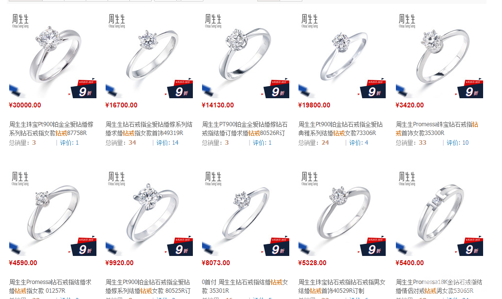 本人懒癌晚期,趁着上班逛了一圈某宝,主要以周生生、潮宏基、周大生等几个潮流时尚的品牌为主,价格并木有优惠活动,一眼看过去没有一点购买欲。