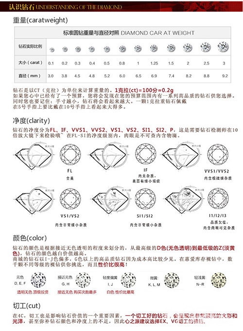 钻石可以参照钻石4C标准来定,即克拉、净度、颜色、切工