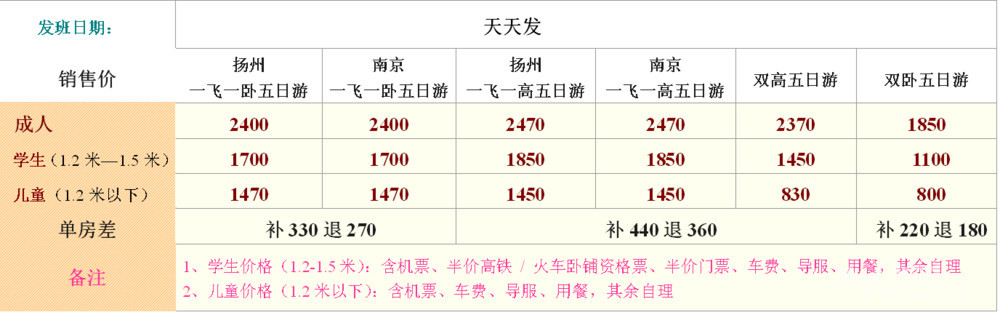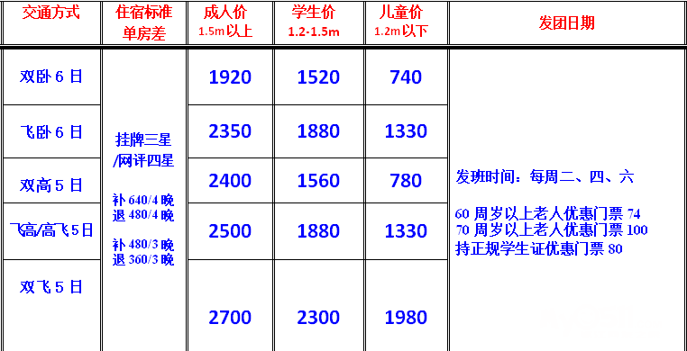 | 5.儿童(1.2米以下)不含门票、床位、火车票/高铁票费用(如有需要建议与成人同时购买)。儿童高铁票政策:1.2米以下免票(无座位),1.2-1.5米之间半票(有座位),1.5米及以上同成人儿童火车票政策:1.2米以下免票(无床位),1.2-1.5米之间资格票80元(无床位,也可自愿购买成人票,有床位),1.5米以上同成人 |