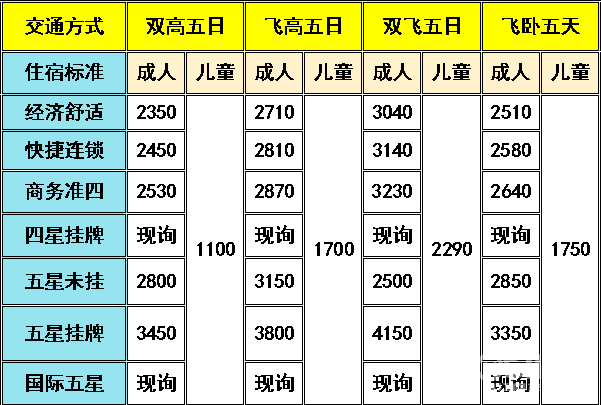 | 5.用餐:成人根据往返大交通三或四顿早餐,三顿午餐(其余用餐自理) 儿童根据往返大交通三或四顿早餐,三顿午餐(均为半价餐,其余用餐自理) |