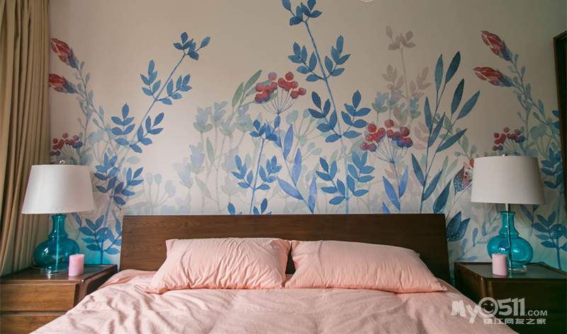 主卧蓝色花卉墙纸,是纯纸还是无纺,其他几面墙是素色吗