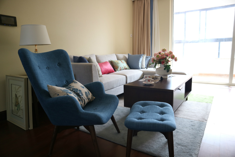 请问客厅那张蓝色的单人沙发,哪里能买到?多少米啊?凳子不需要