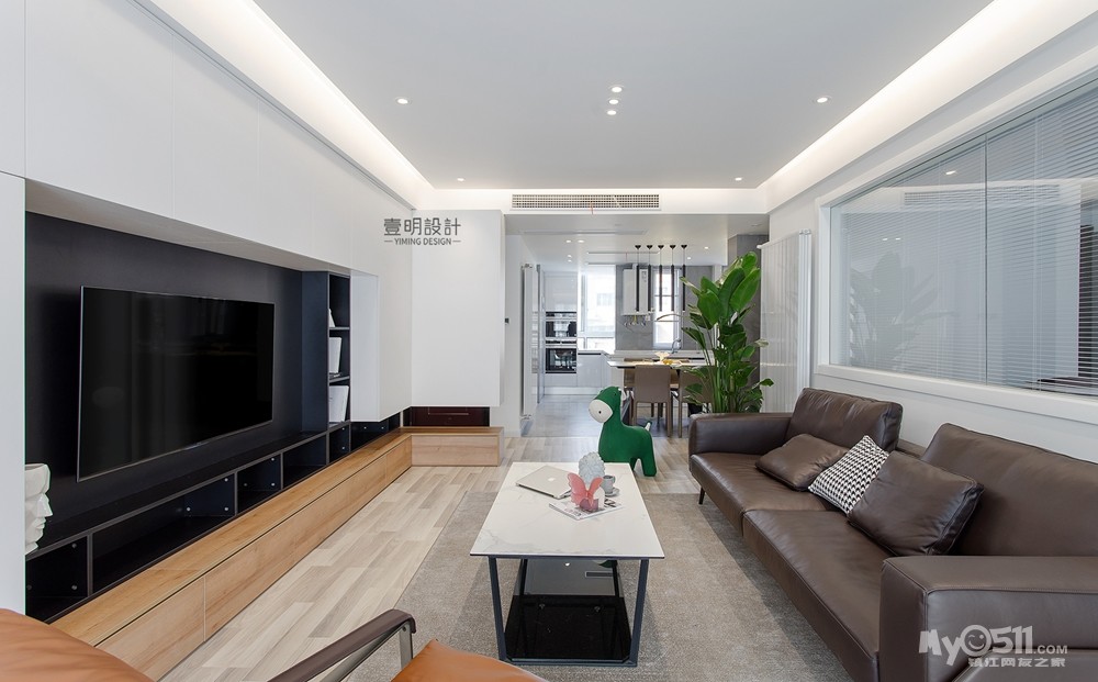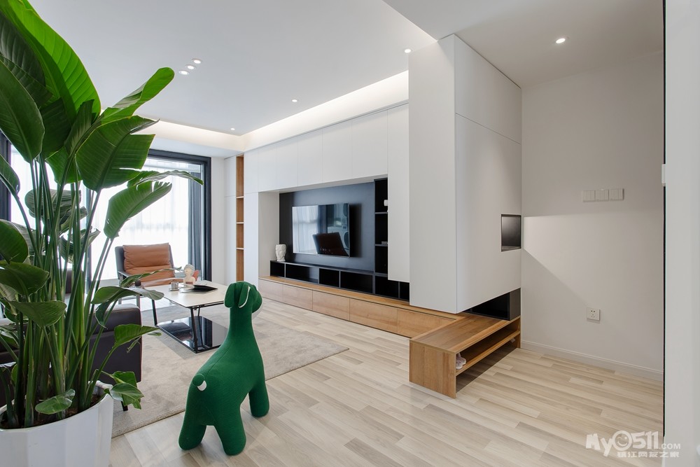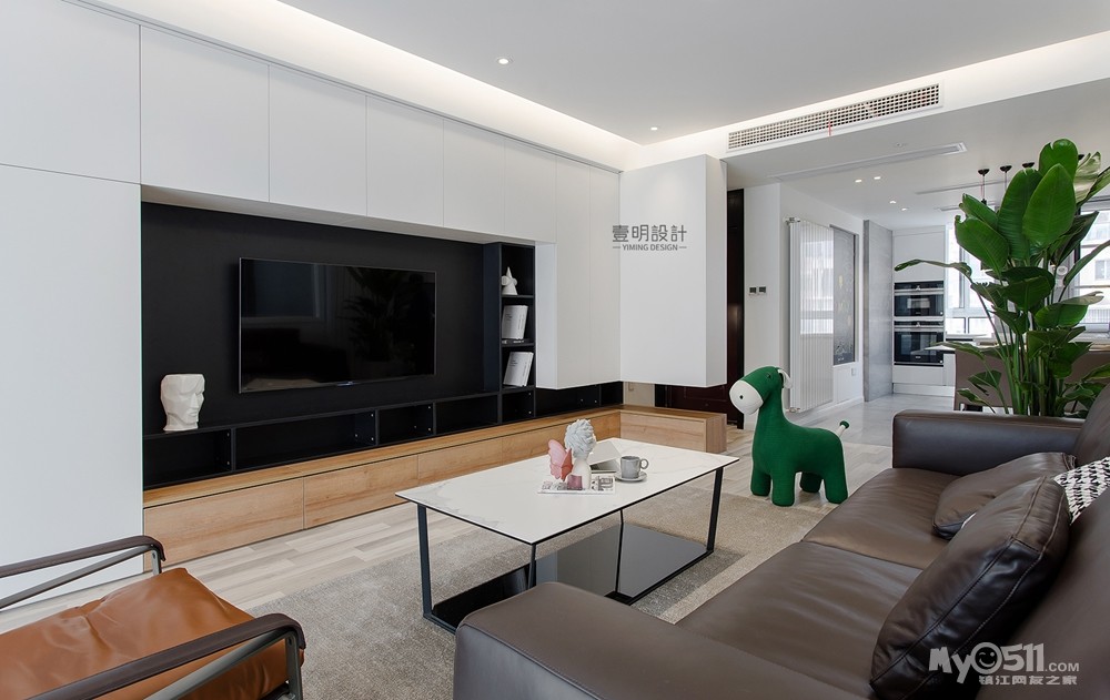 电视背景墙采用的白色+黑色+木色的设计搭配构造,营造更好的层次。