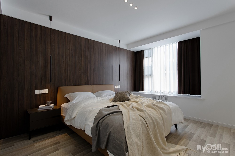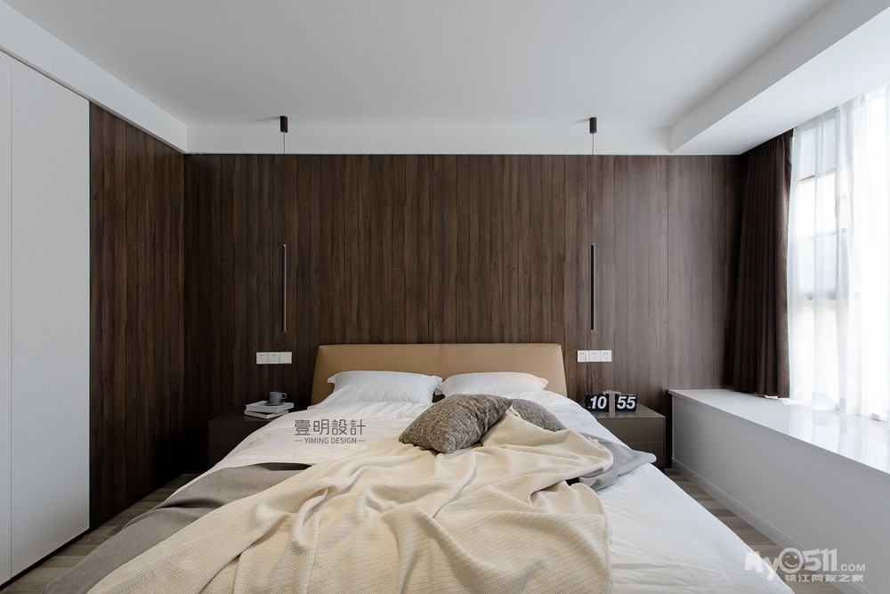 主卧室的设计后背景采用的是木饰面,带转交,渐变过渡到书柜,更加自然。