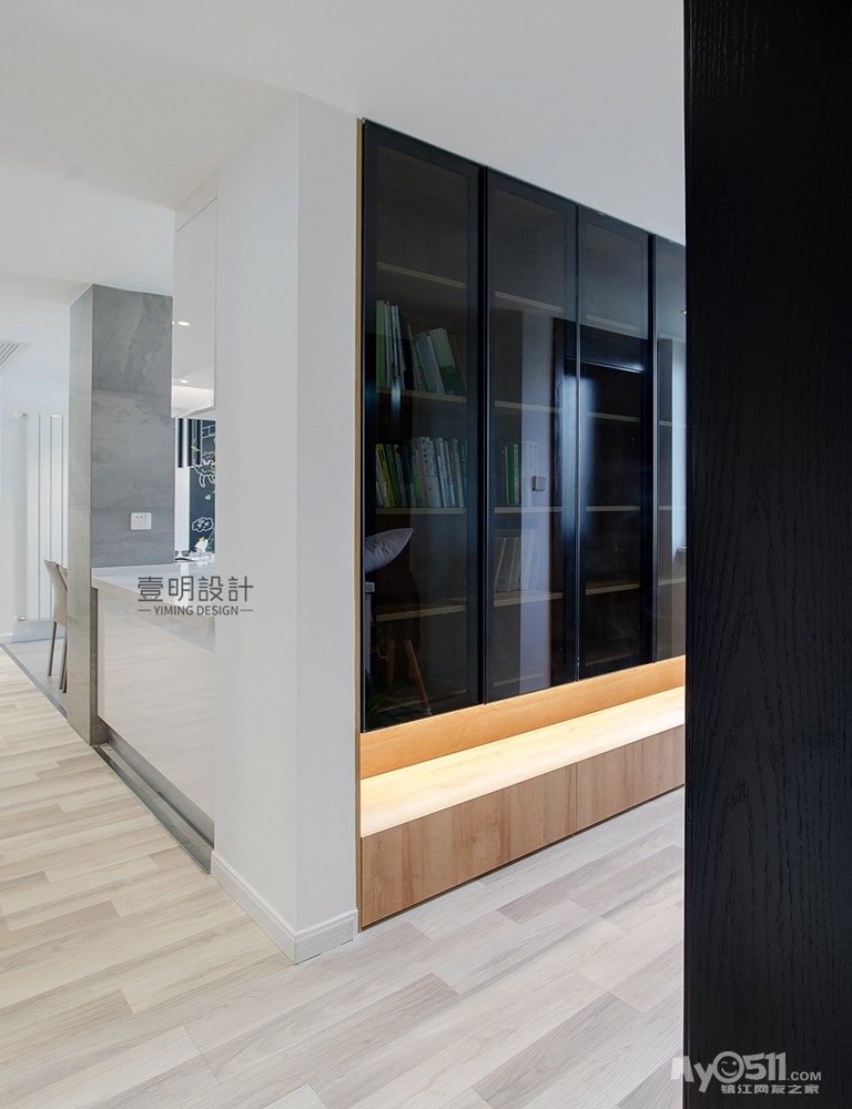 此处是原有结构因为厨房做了开放式后,把原有墙体往厨房内部缩小,嵌入了一组书柜,满足主家需求,