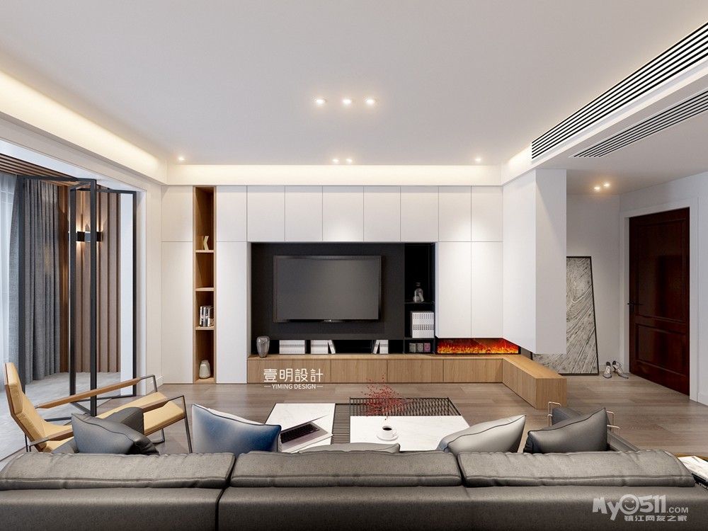 客厅的设计采用无主灯的设计,阳台采用的三联动移门 ,这样不会显得客厅拥堵,