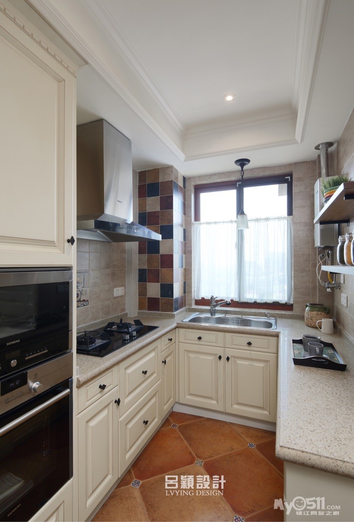 橱柜当时是选择L型还是U型经过了艰难的抉择,最终屈服于现实,选择了更为实用的U型,墙上的花片有点偏位,这是我耿耿不能释怀的地方