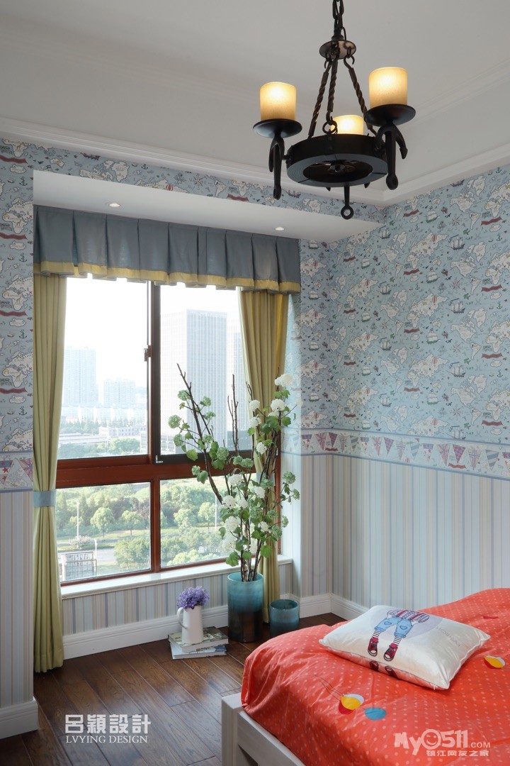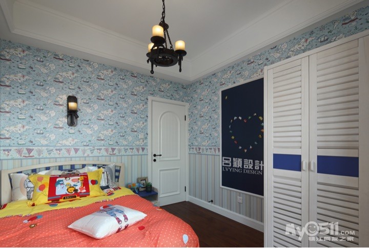 宝贝房间选择了帆船的主题,帆船的壁纸,帆船的灯,颜色也是比较男孩的蓝色系,也搭配了蓝色的黑板漆。说到色调可是跟宝贝商量了好久,因为他喜欢橙色,可是橙色大面积贴墙纸会比较胀眼,也不太适合美式搭配,最后只能在床品上满足他,他可是闹了好久呢