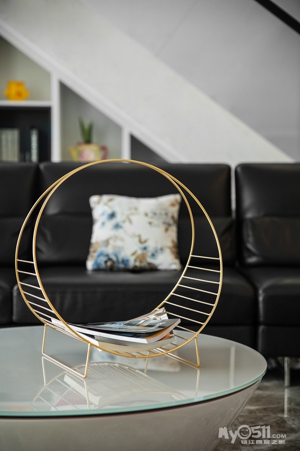 填充深灰色调家居装饰,茶几、摆件、家具支架及墙面上的装饰线条等处,调动室内元素装饰出奢雅的视感。