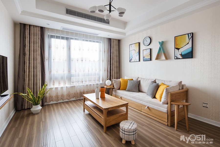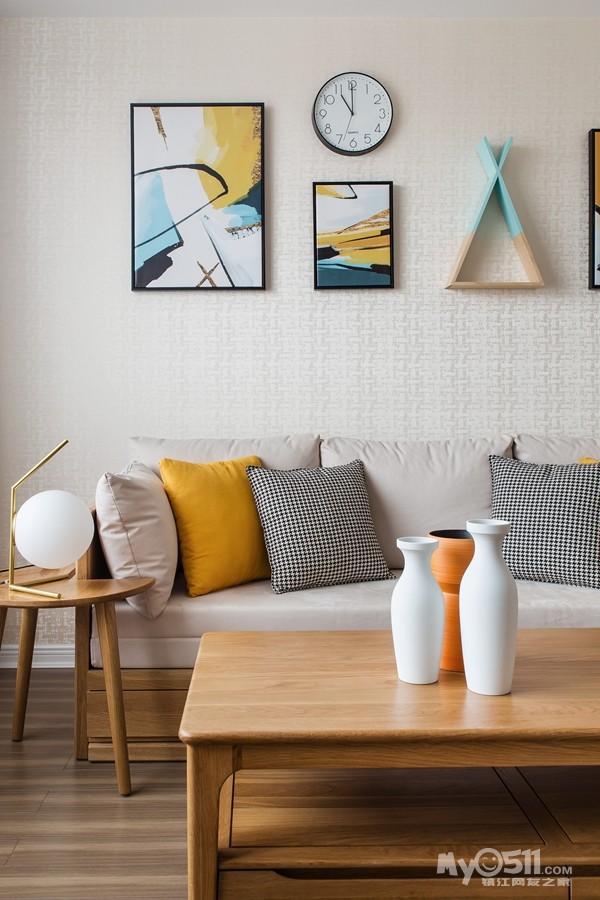 温馨的原木地板、舒适的布艺家具、极具艺术的灯具,为家增添了几分艺术气息。