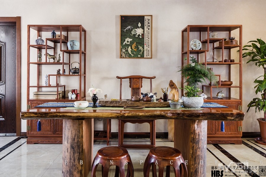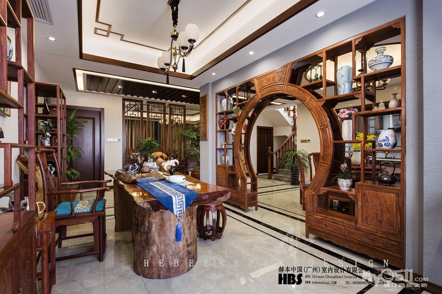 以古香古色的设计风格为主调,多以红木为主,色彩方面讲究对比,造型方面讲究对称。