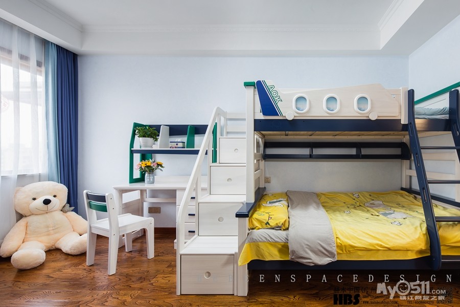 为了更大的利用空间,儿童房里用了上下双床,楼梯刚好可以作为抽屉,增加了房间的储物功能。