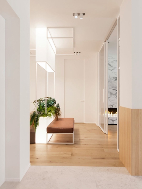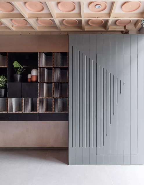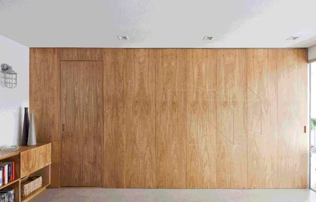 为了让门缝隐匿于墙面,可以整面墙都做线框几何的设计,