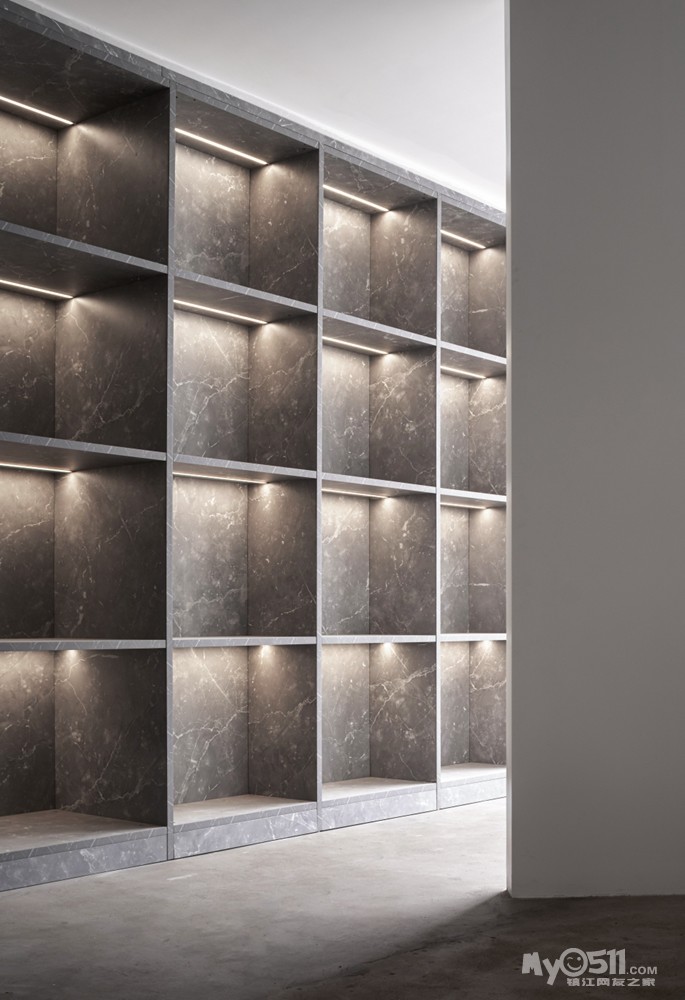 格子的序列不仅体现在展柜,也体现在水泥砌块里。