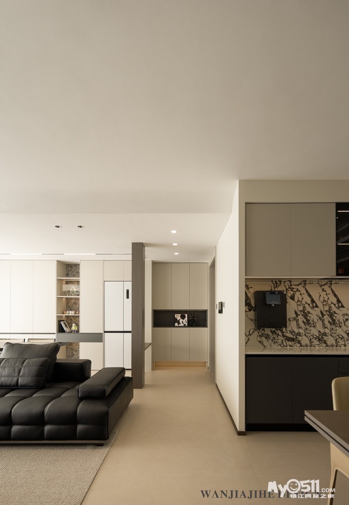 ▲将原始入户的朝南房间扩展为客厅空间,这样就拥有了一个超大横厅,右手边做了一组多功能收纳柜。同时,把冰箱融入到了多功能收纳柜里面,做内嵌式冰箱,与柜子融为一体,既美化视觉感受,又满足业主想要扩大厨房操作空间的愿望。