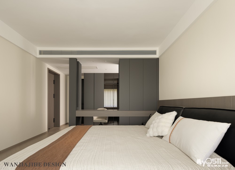 主卧床头下口延续了木饰面的肌理