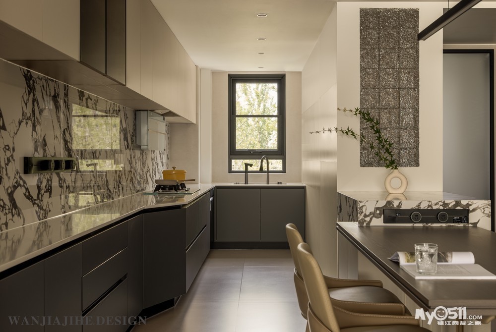 在材质选择上与厨房背景墙隔相呼应