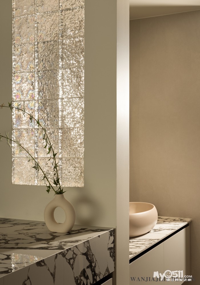 洗手池干区加入玻璃砖、花纹台面