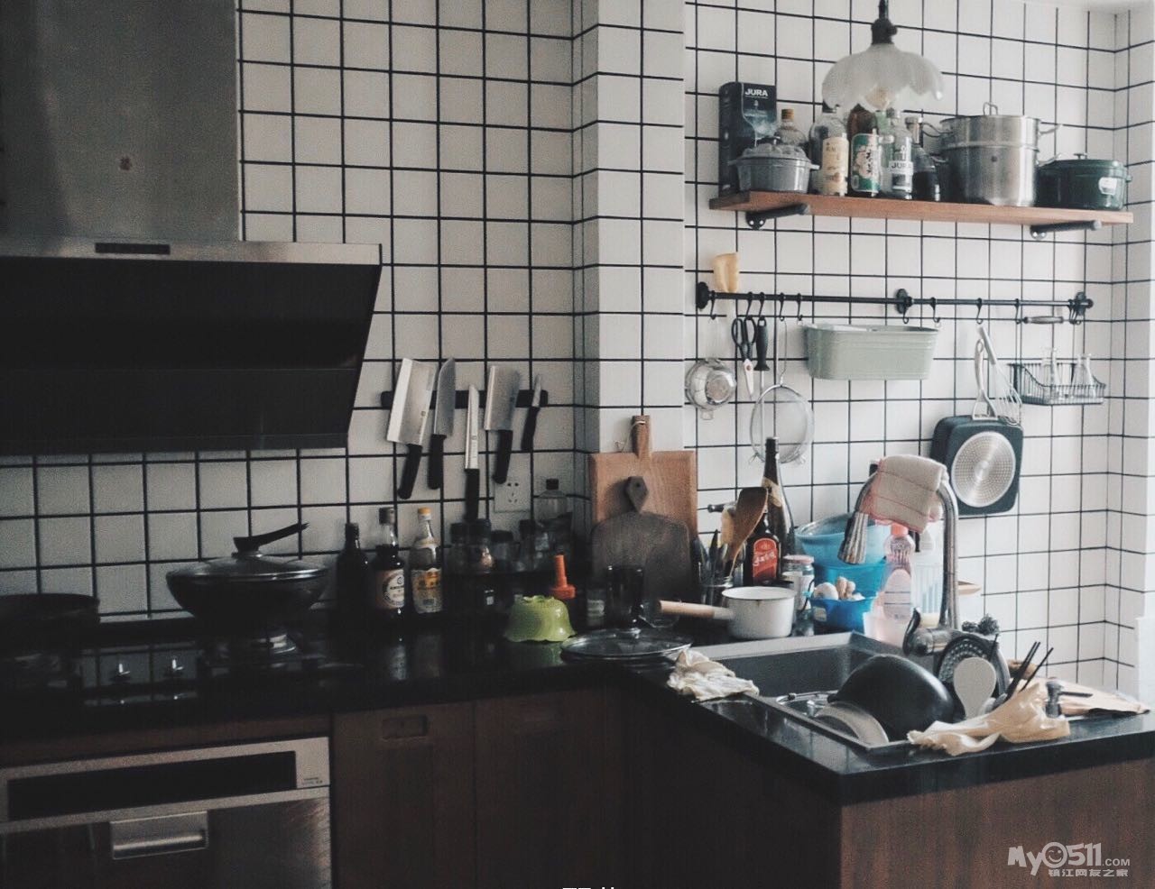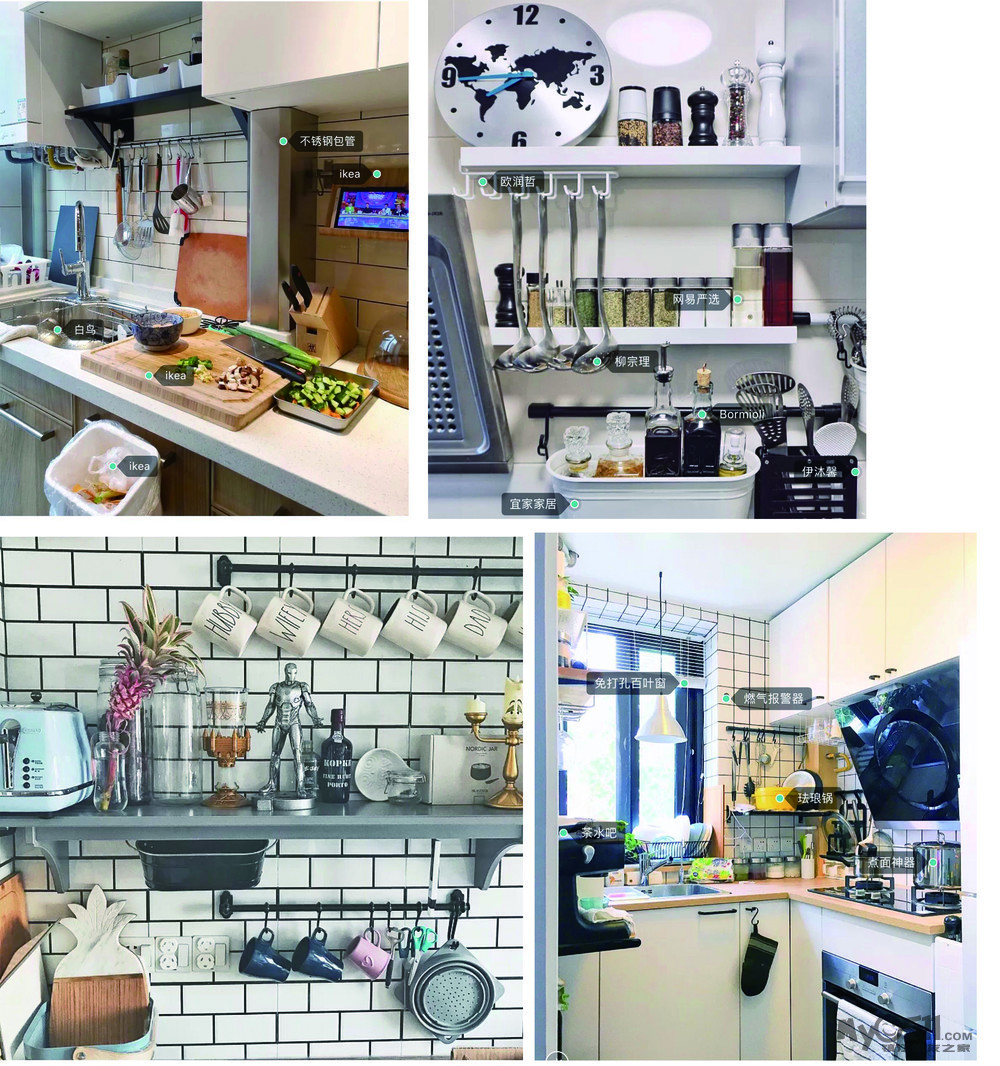 小空间的厨房收纳,除了橱柜,吊柜,合理的利用墙面的隔板,开放型架子,吊钩,空间会有很大程度的利用。常用的东西要放在触手可及的地方,既要立刻看得见,又要方便及时拿到,吊柜里则可以储藏一些不常使用的锅具,食材,餐具。(爱烘培的盆友一定会深有体会,模具多到恨不得自己有个大仓库)