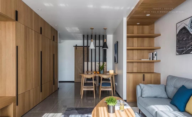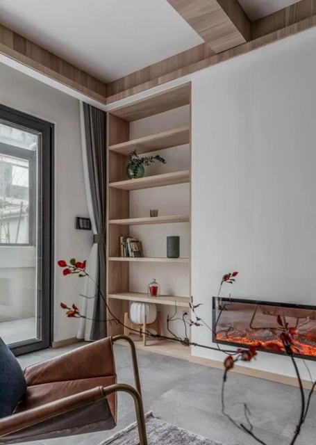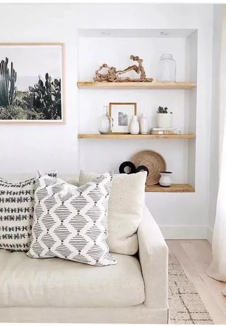 木质壁龛是比较很常见,原木的颜色也相当百搭,有一种内嵌柜的感觉。