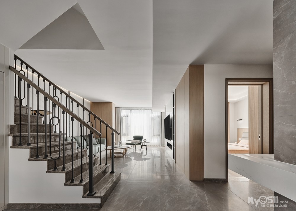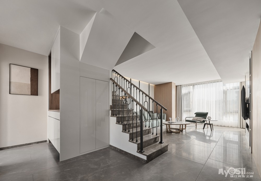 石材踏步板和铁艺扶手简洁明了,做工工艺要求较高。色彩和外形简洁,与整个室内空间统一。虽然看似平平凡凡,却体现出设计师及业主的高雅品味。与那种追求丰富色彩及浮夸造型形成鲜明对比。
