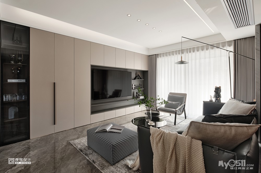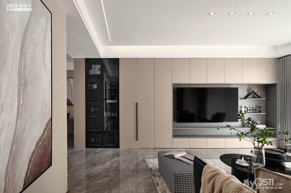 看到灰色亮面地砖,满墙柜子的电视墙就够够的,10家有9家都这么干。