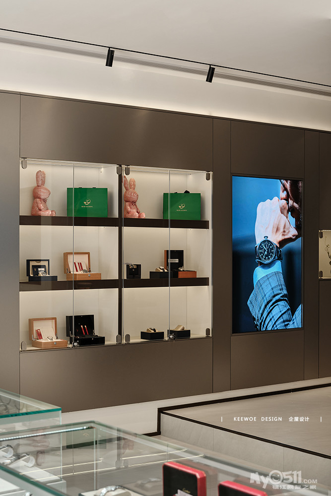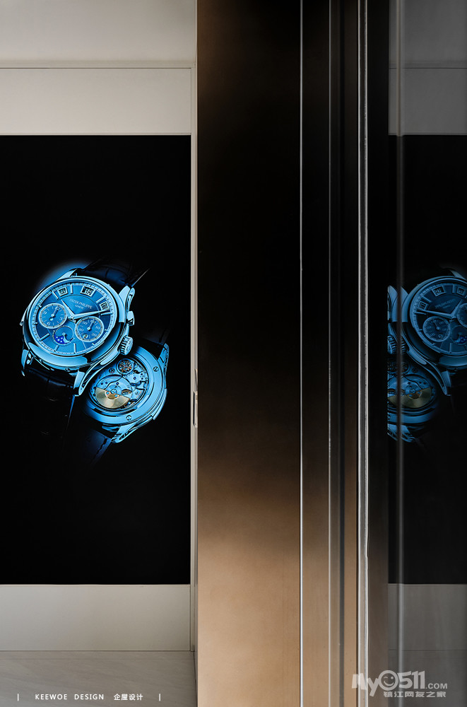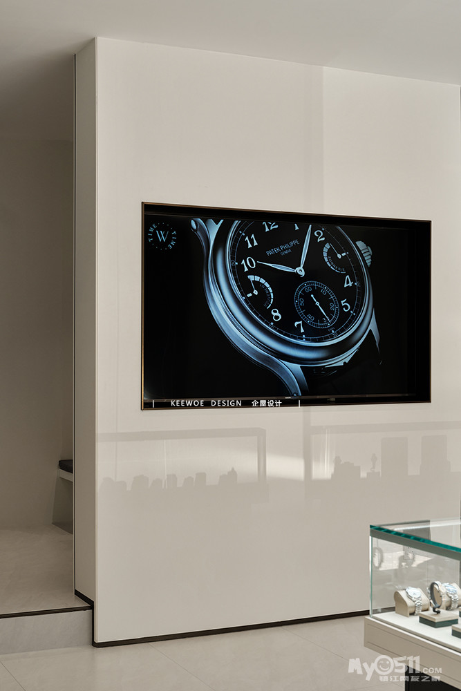 手表的展示墙在细节处减少了繁杂的装饰,金属色与极简造型在简洁与质感之间达到了一种平衡。