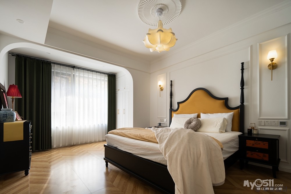 主卧床头背景采用线条的造型,加上个性的主灯和壁灯,床选用黑色实木,打破传统设计方式,窗帘也是采用橄榄绿色系!