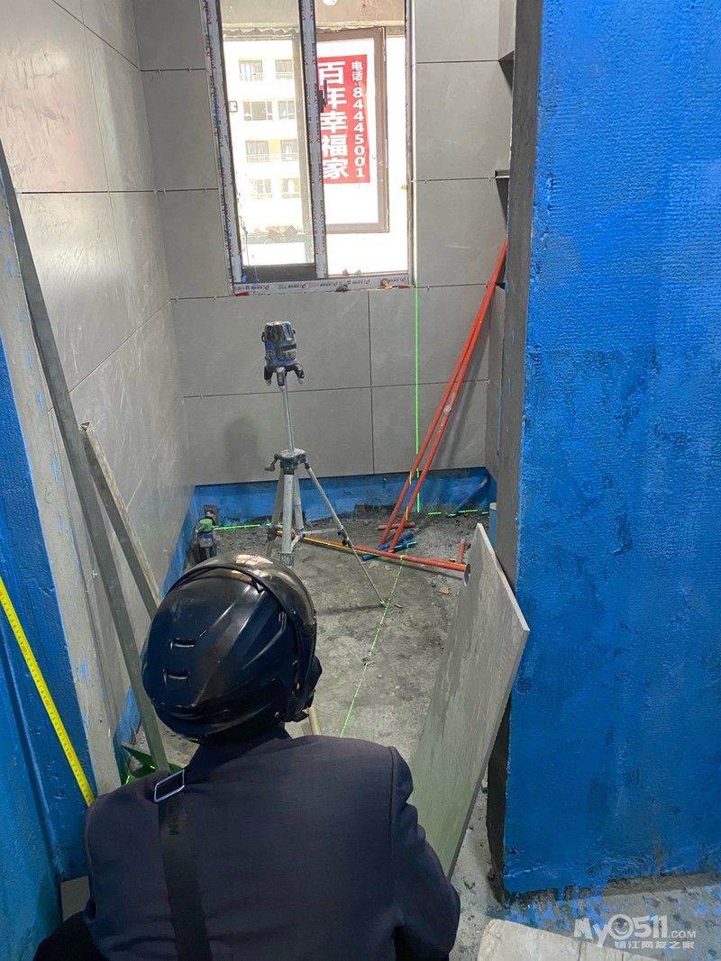 上午去的时候,正好遇见监理来视察,对每个贴好了的角都用水平仪进行测量校验