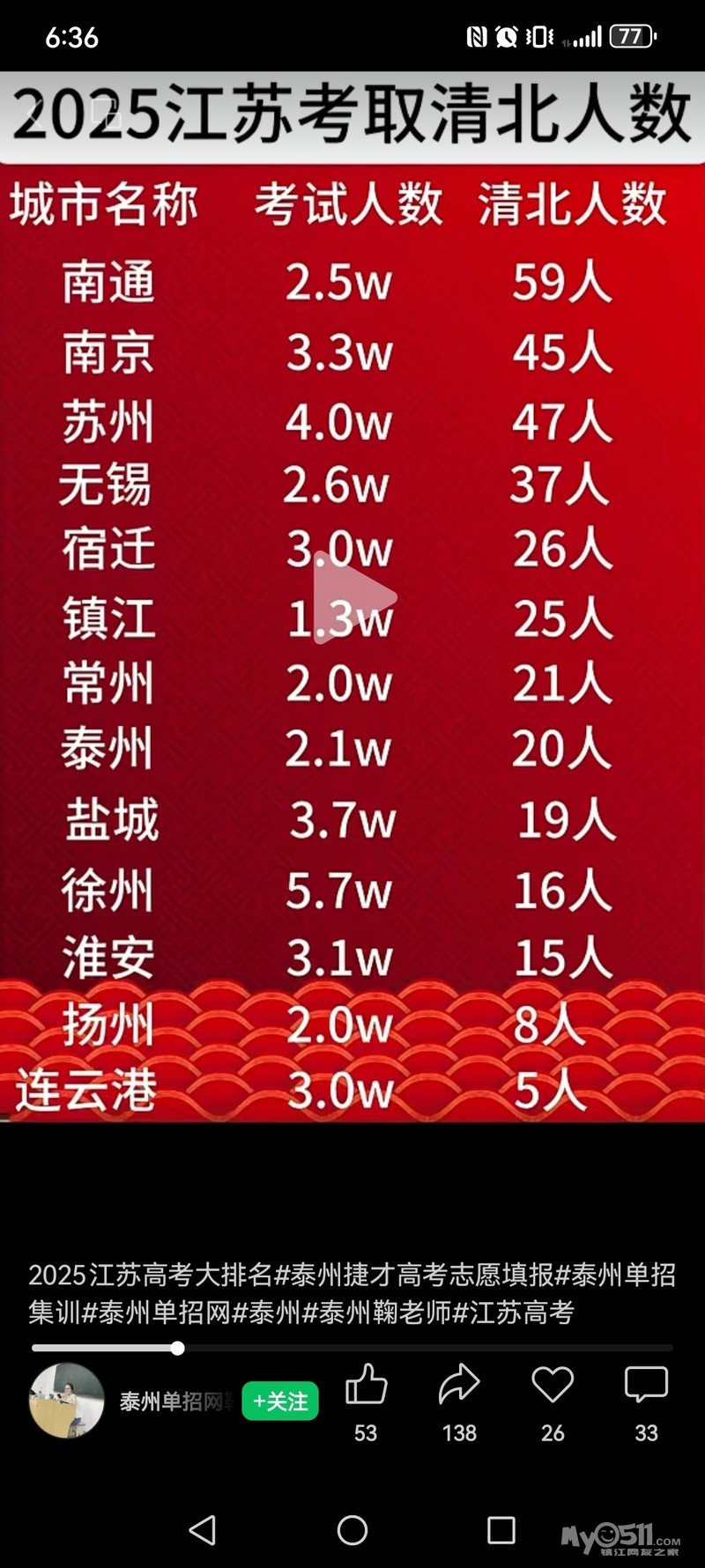 仅供参考,镇江清北的比例并不低,当然丹阳的贡献不小