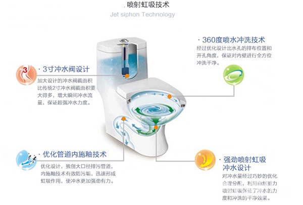 从冲水方式来看,马桶大致可分为:冲落式(普通冲水)和虹吸式。虹吸式与普通冲水方式的不同之处在于它一边冲水,一边通过特殊的弯曲管道达到虹吸作用,将污物迅速排出。而虹吸式又分为冲落式、涡流式、喷射式等。虹吸涡流式和喷射式设有专用进水通道,水箱的水在水平面下流入坐便器,从而消除水箱进水时管道内冲击空气和落水时产生的噪音。也就是目前市场上推行的“静音马桶”。虹吸喷射式具有独特的水嘴,能喷射强力水流,使冲洗效果更佳。