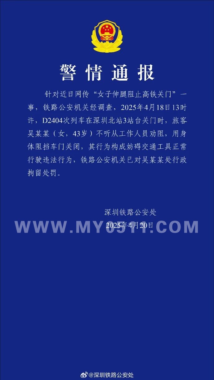 记者4月19日从广州铁路公安局深圳公安处获悉,近日,一名旅客在深圳北站强行阻挡列车车门关闭,已构成“妨碍交通工具正常行驶”违法行为,被深圳铁路警方行政拘留。