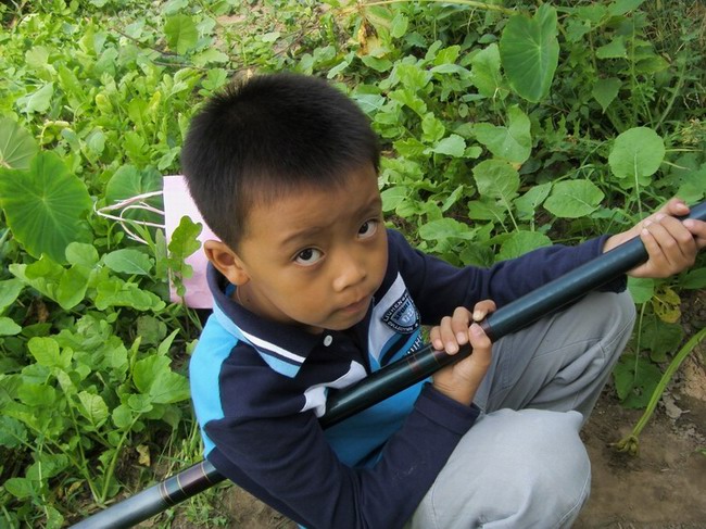 到了河边,我们先把鱼食打进河里,然后把蚯蚓穿在鱼钩上,就“开钓”喽!