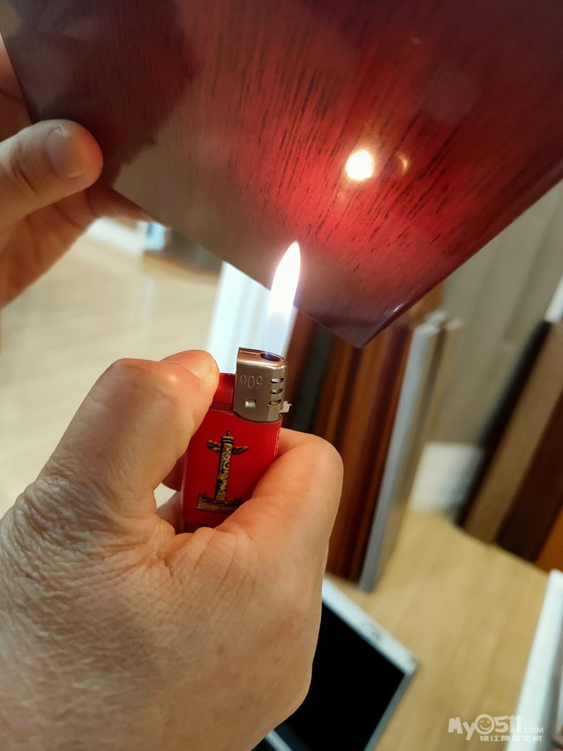关于耐高温这一项,比较有意思。大多数商家在我提出检验耐高温检测的时候都说可以,比如久盛,老板用点燃的香烟平放在地板上,地板没有被烫坏,出现灼烧痕迹,但其实因为接触面比较小,香烟接触面温度并不高,所以这样测评并没有多大意义,在其他商家,我要求用打火机的外焰来检测,结果是大多数地板在外焰的高温下十秒钟左右,油漆层会被破坏。所以家庭日常使用中,除非发生火灾,基本日常不会被高温破坏油漆层。