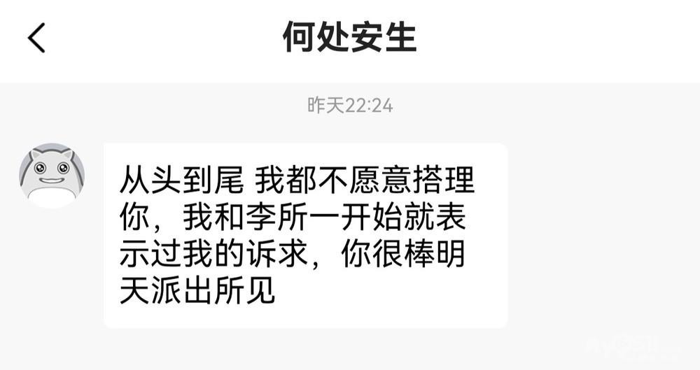 扬子公司、华东出租车公司负责投诉处理的工作人员已经代表公司向我道歉了,但我始终没有等到“你”个人的一个回应。相反,“你”还去派出所报案说我侮辱“你”,侵犯“你”的个人隐私。