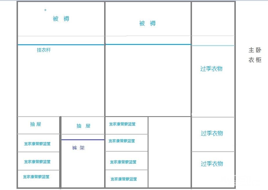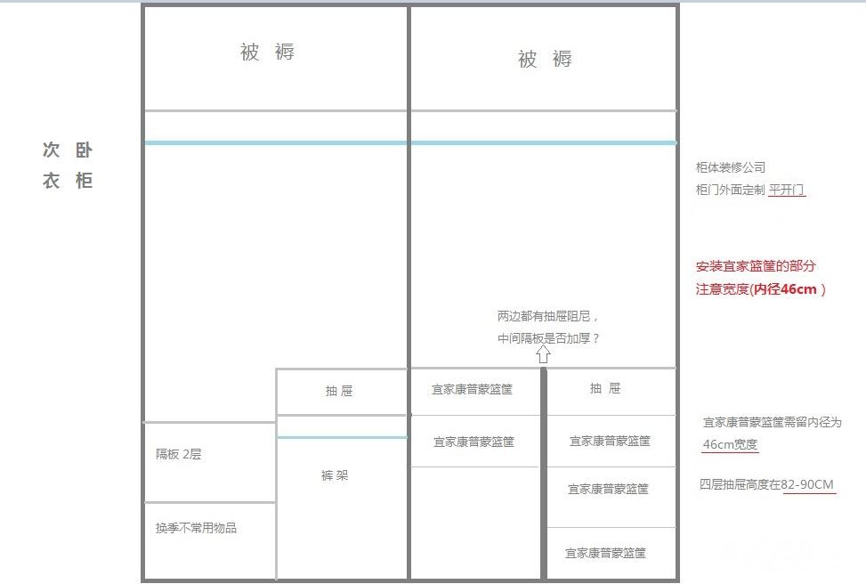 以上两个房间的柜体结构,出镜率最高的是宜家的康普蒙篮筐,建议也想这么操作的童鞋,提前买好哦(到时让师傅弄一下),所以楼楼6月初要再奔一次宜家,这次是采购篮筐们~