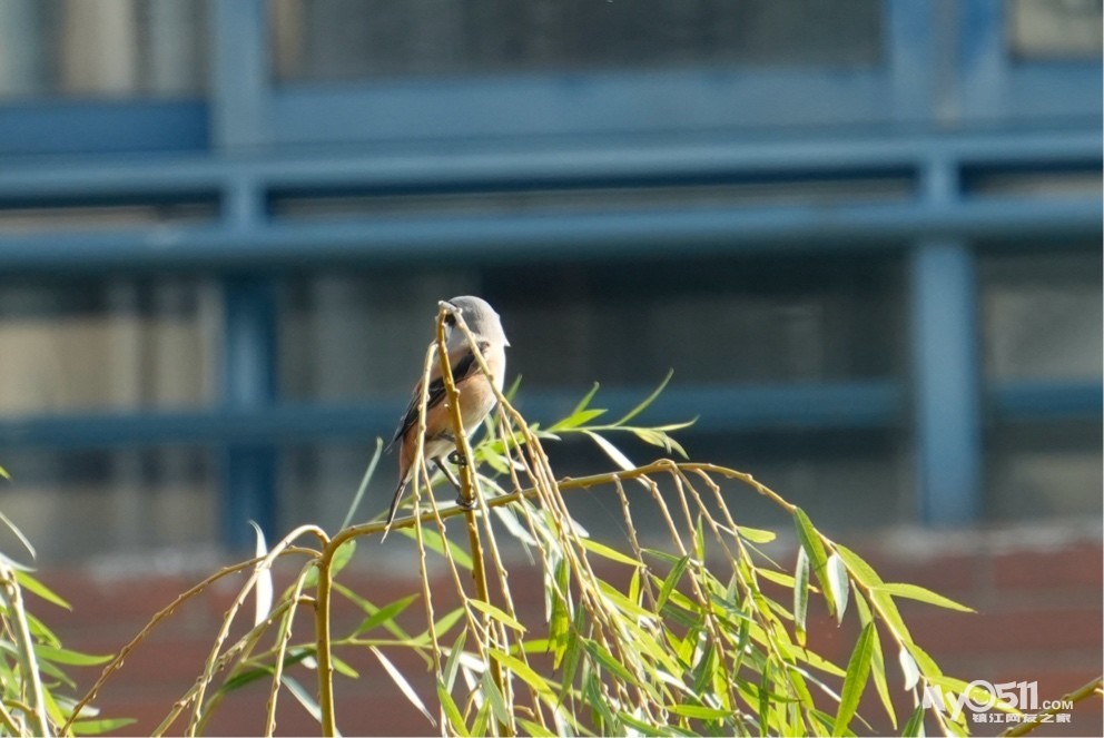 来了一只萌禽,应该是棕背伯劳,隔的太远,又有树枝挡了,不太清楚。