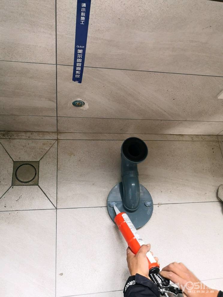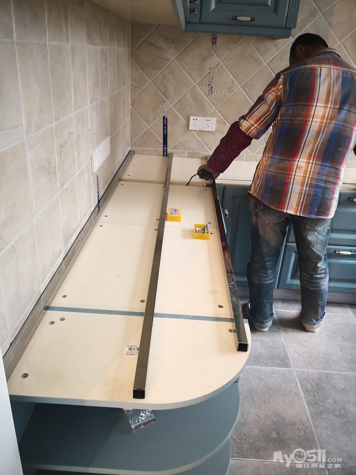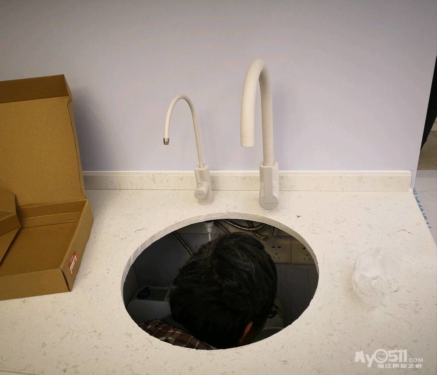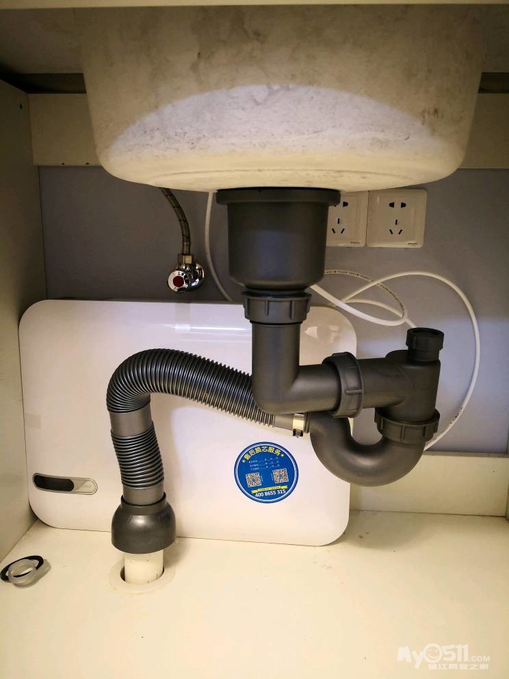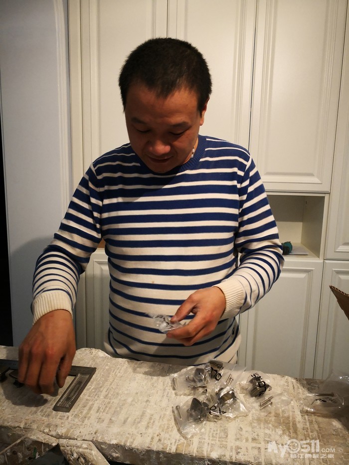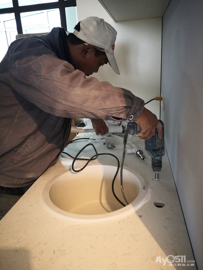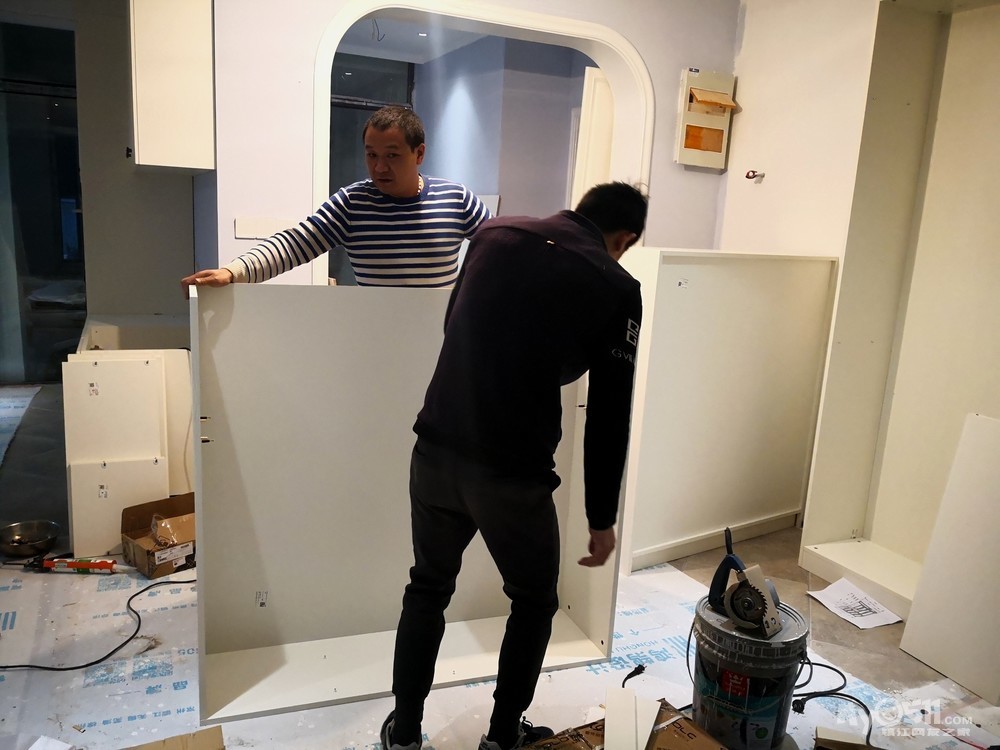 师傅先把下水管用弯头改到中间,然后安装两边的柜体。