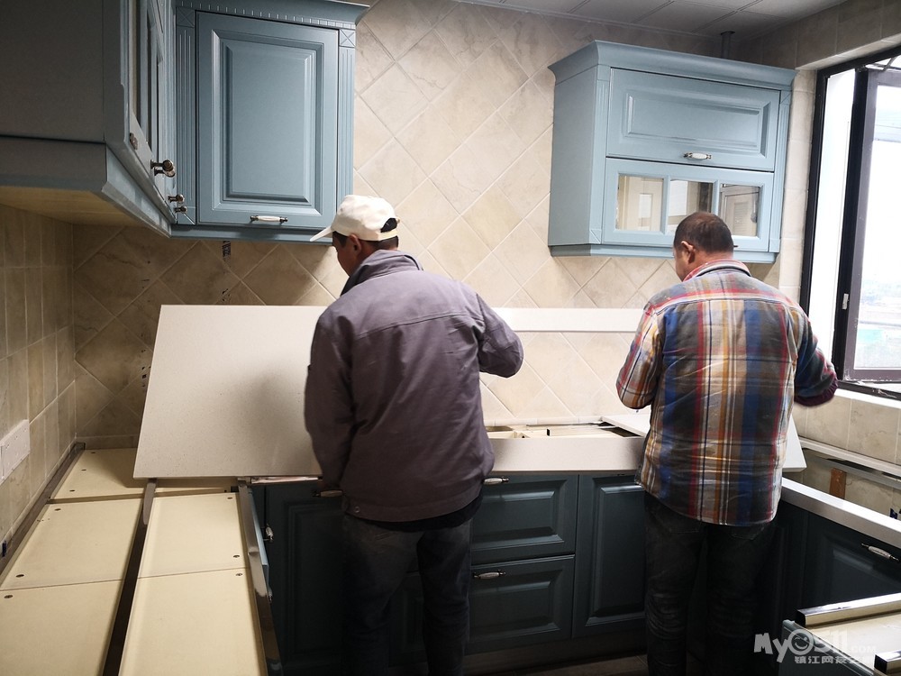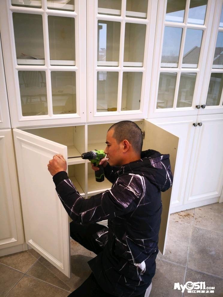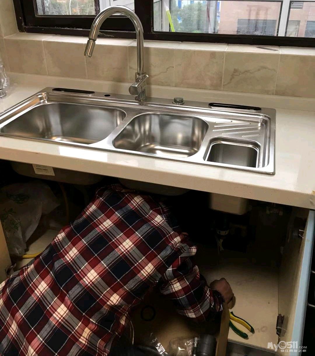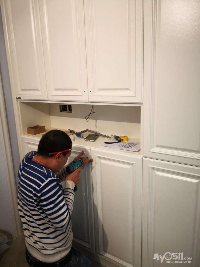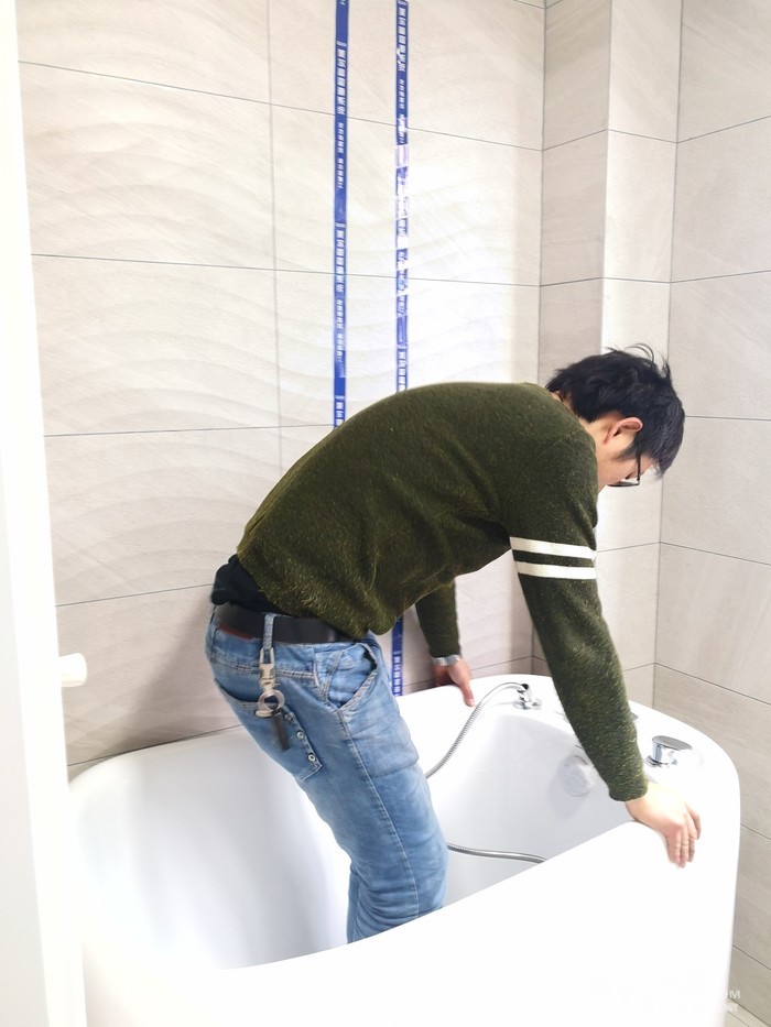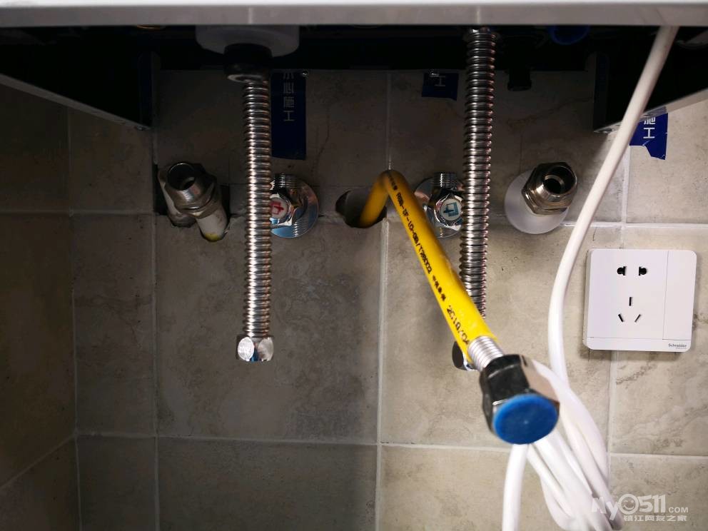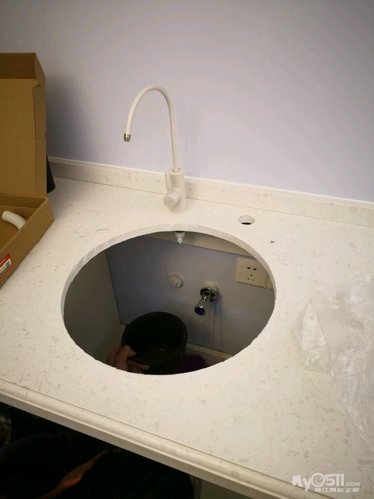 师傅先把下水管用弯头改到中间,然后安装两边的柜体。