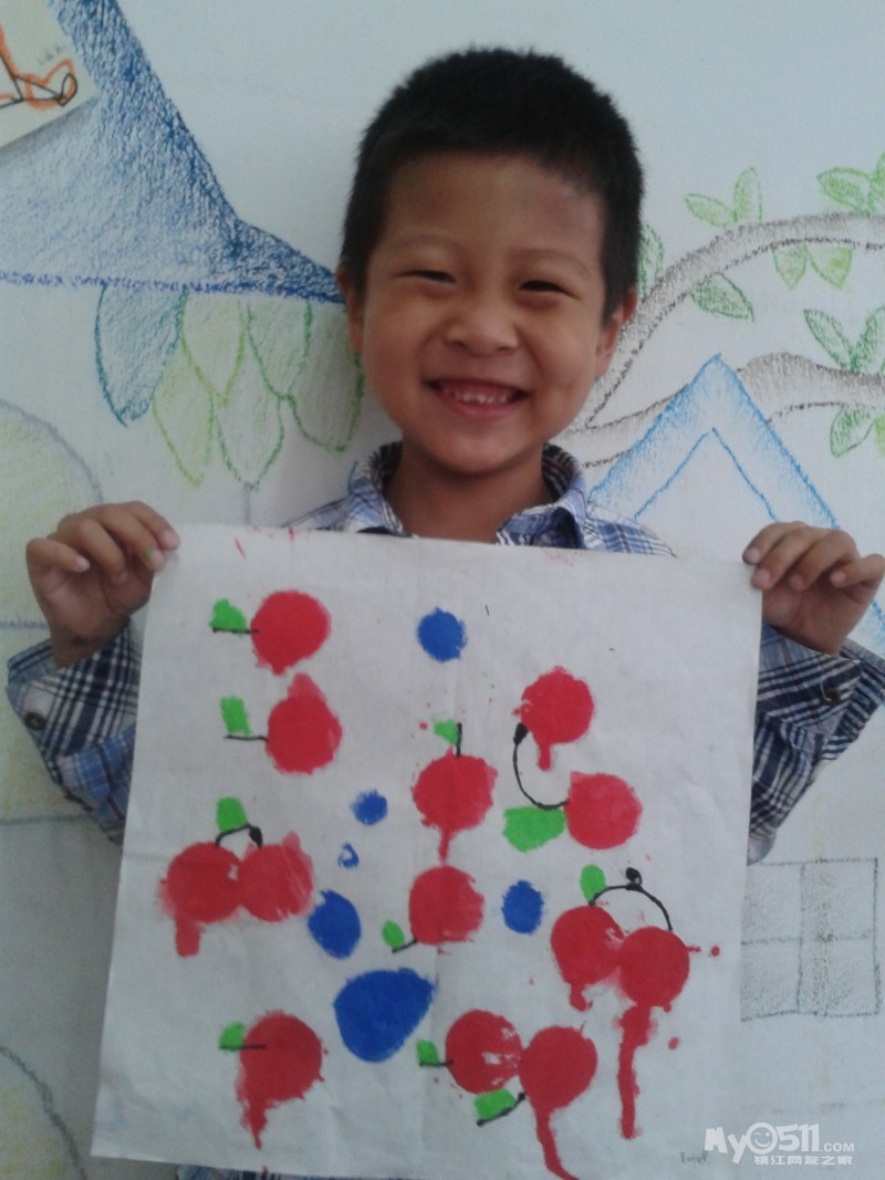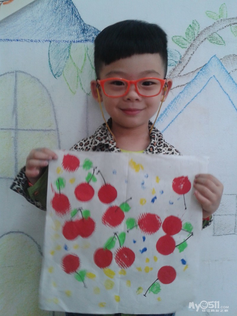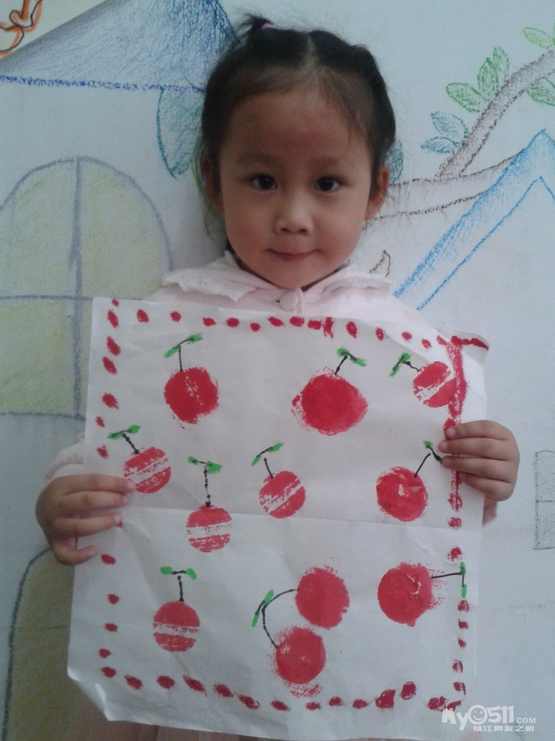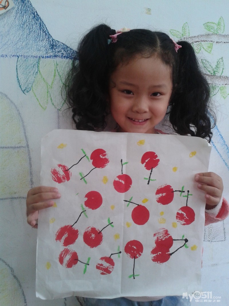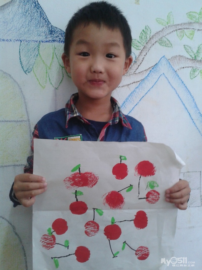 小朋友们画的可爱樱桃来喽。我们先拓印出红红的樱桃,然后再添上它的叶柄,用油画棒画上好看的小叶子,爱动脑筋的小朋友还添画了小圆点进行装饰,真是漂亮极了!