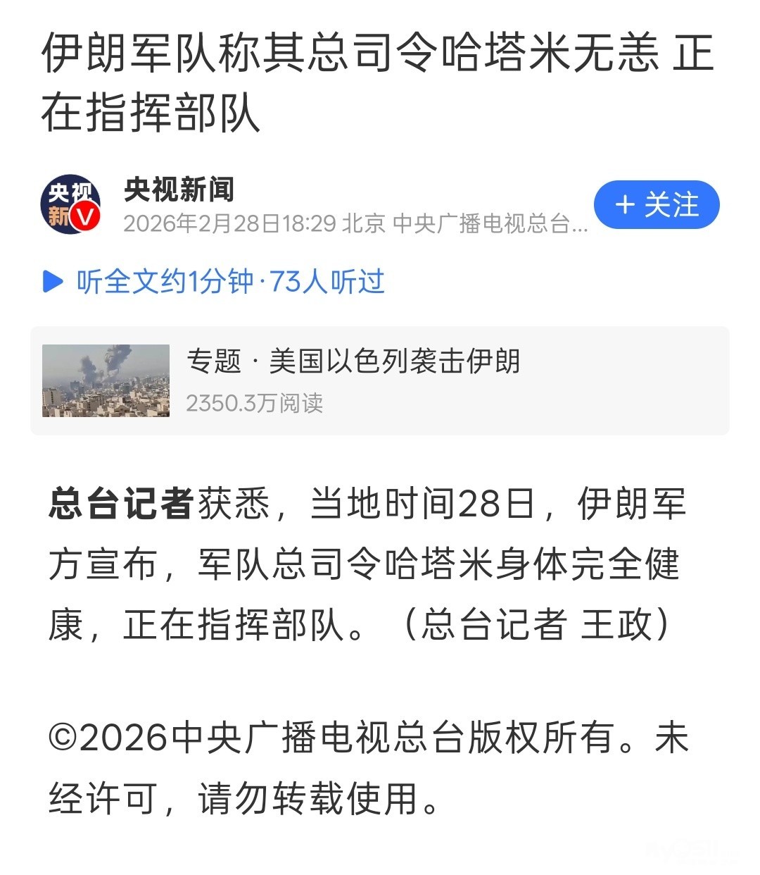 别误导,央妈的信息来源:伊朗军方!