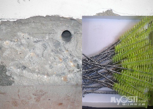 7、植筋:将钢筋插入孔内,在钻孔位置用植筋胶将钢筋锚入混凝土里面深度一般大于11cm(深度根据钢筋大小而定)。