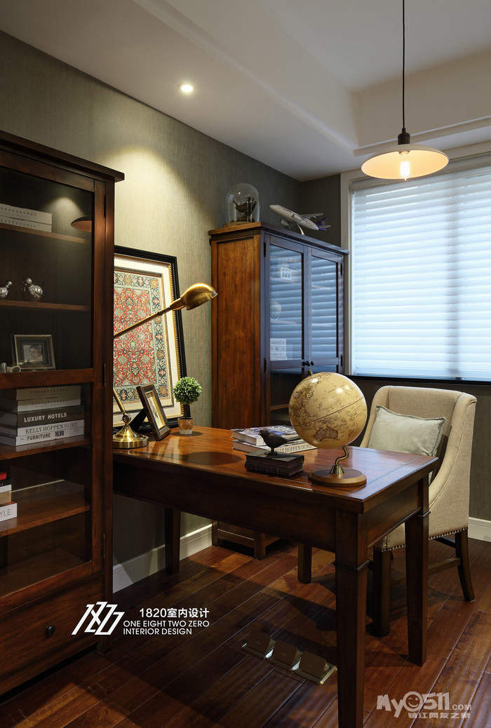 木质的书柜、书桌结合布艺的椅子营造初一种宁静的氛围,温暖的阳光让经典的味道在整个空间弥漫。