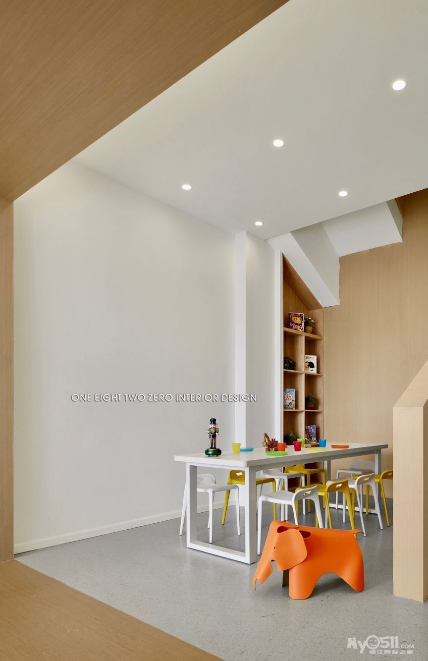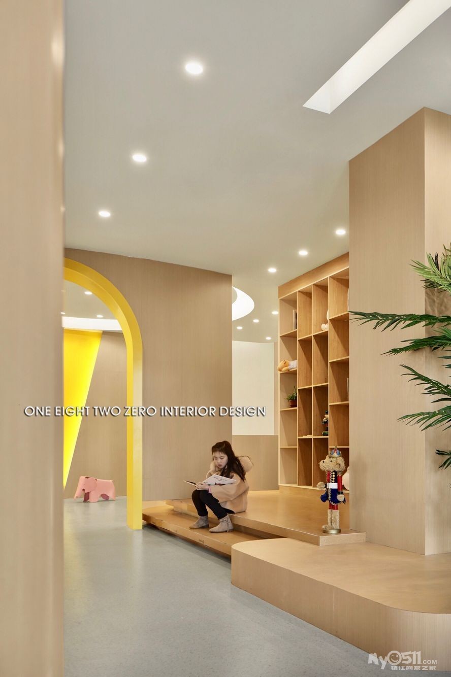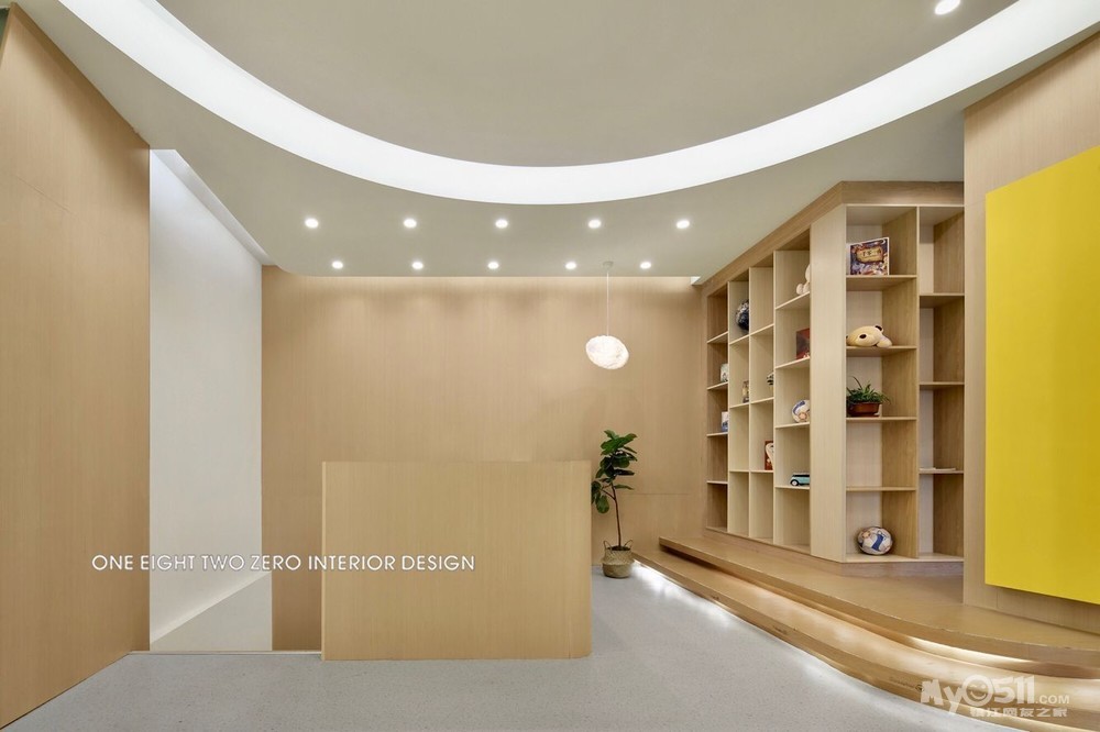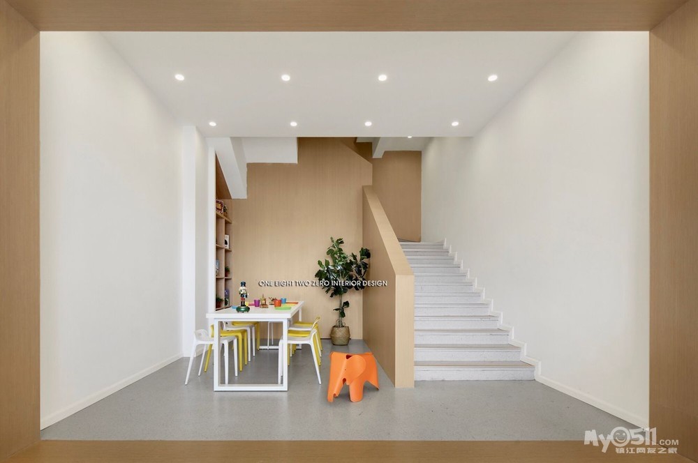 整体空间不仅迎合了教学环境的各种需求,还以一系列开放灵活的空间规划营造出舒适的成长空间。在视觉表现上,设计师选择了一种宁静、简练、温暖且兼具现代美感的表现手法,用简练的几何线条、明快的色块、柔软的纹理及材料,构筑了一个高品质的教育培训机构。