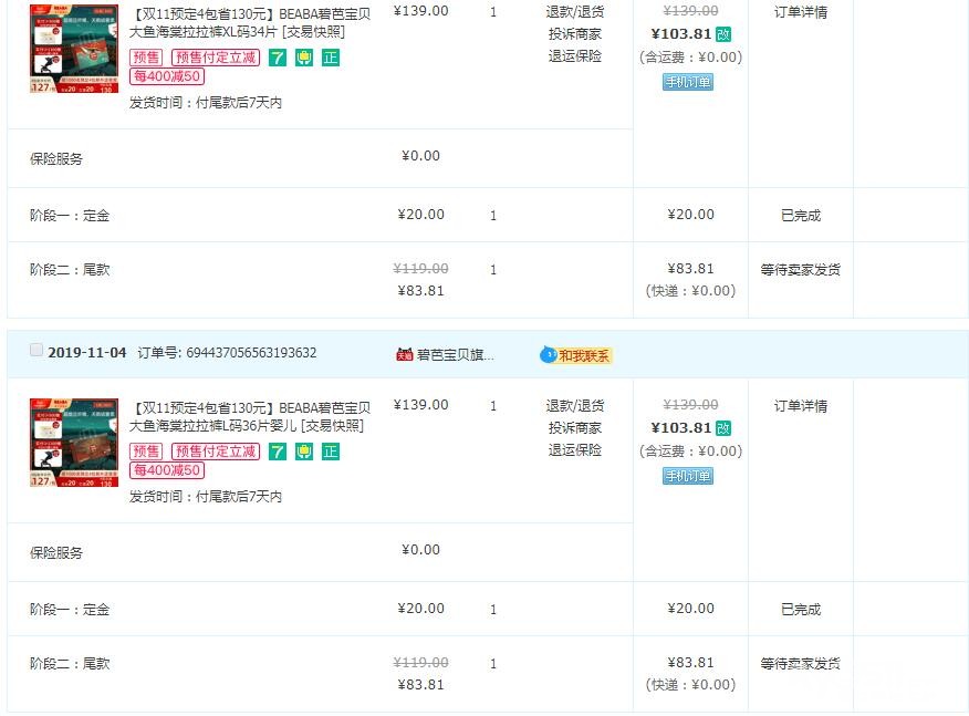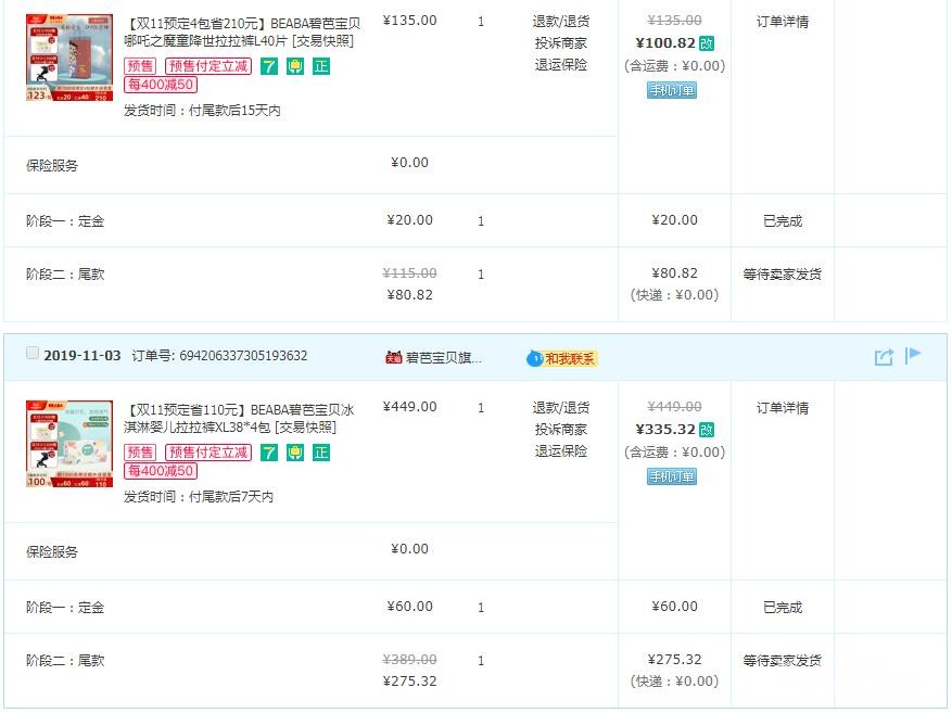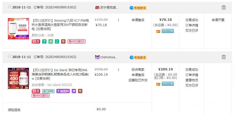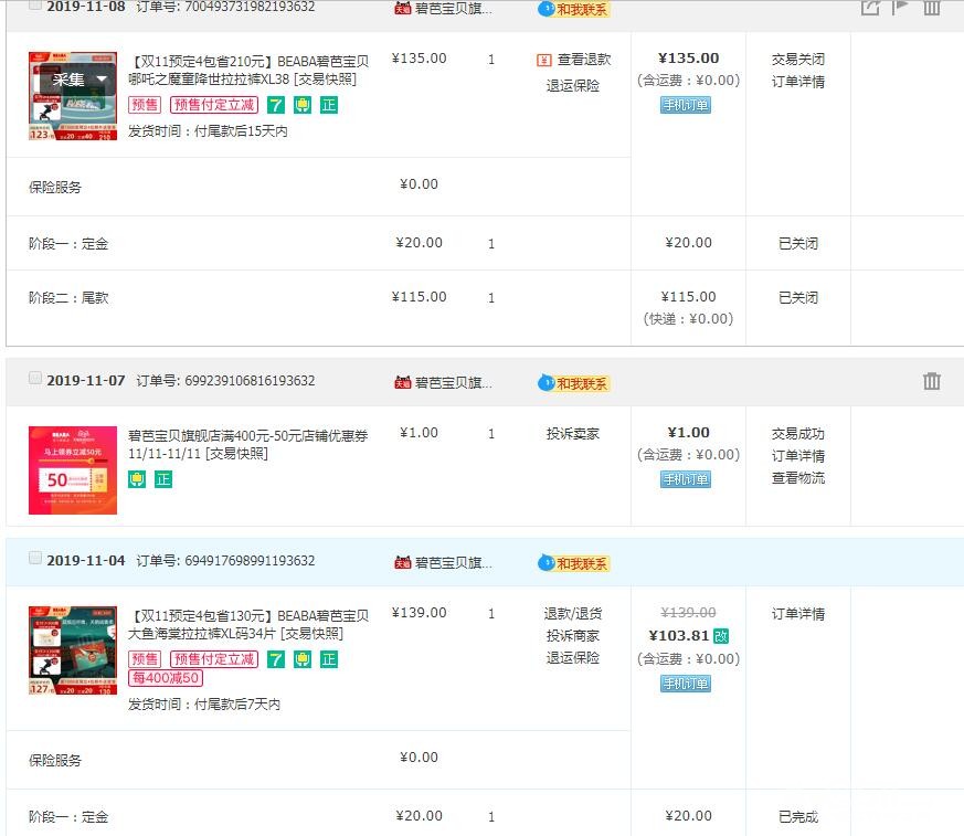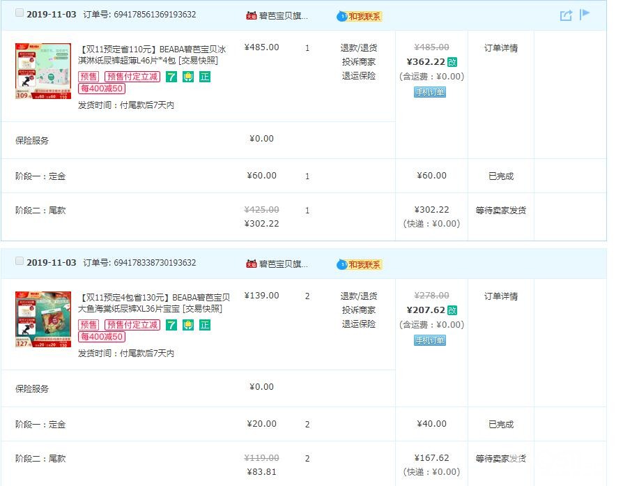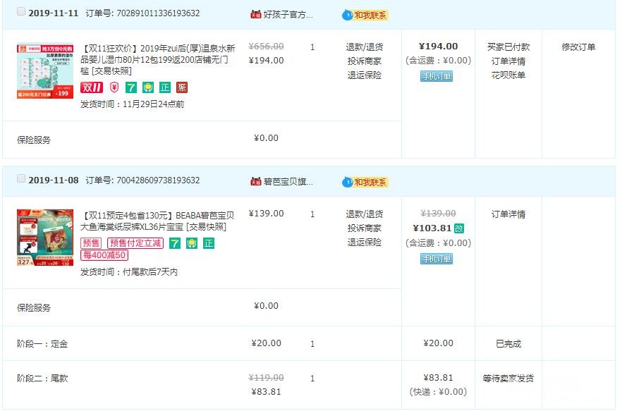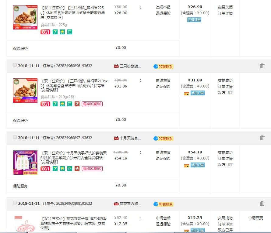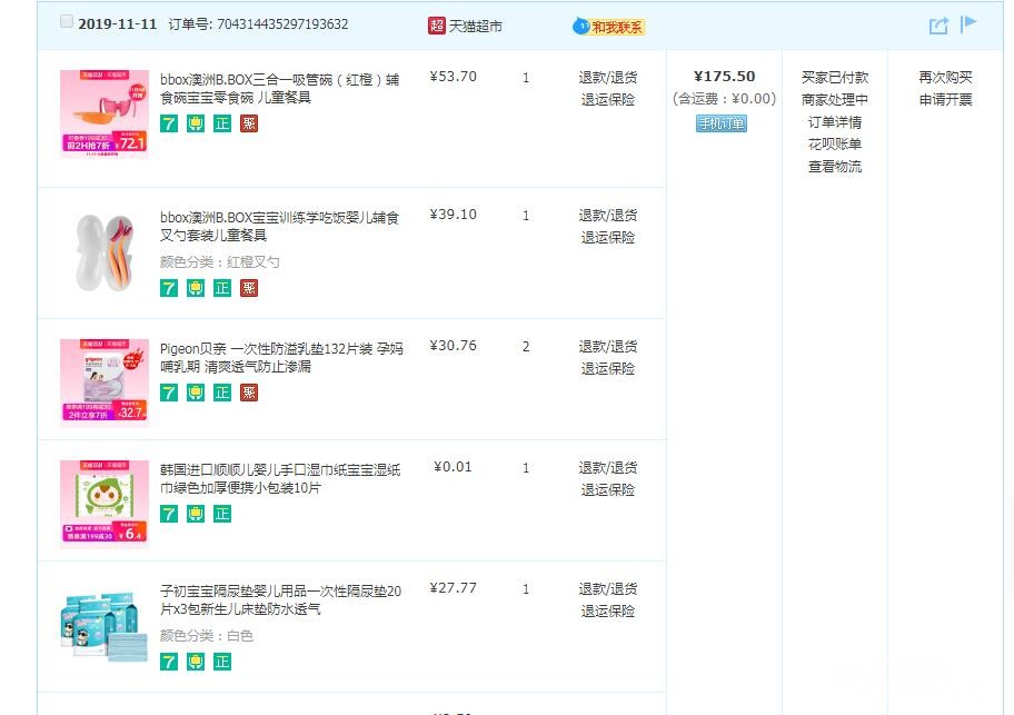 还秒了一些其他的小件,再翻看一下之前去年双十一的购买清单,鲜明的对比啊,这次都贡献给了娃!有了娃之后打开淘宝推送的都是娃的东西了