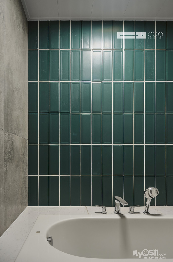 主卫墨绿色小长砖装饰起墙面,