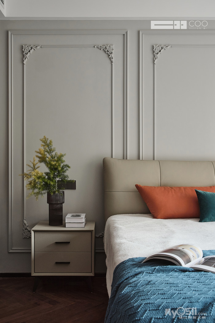 搭上米灰色床头与边柜,