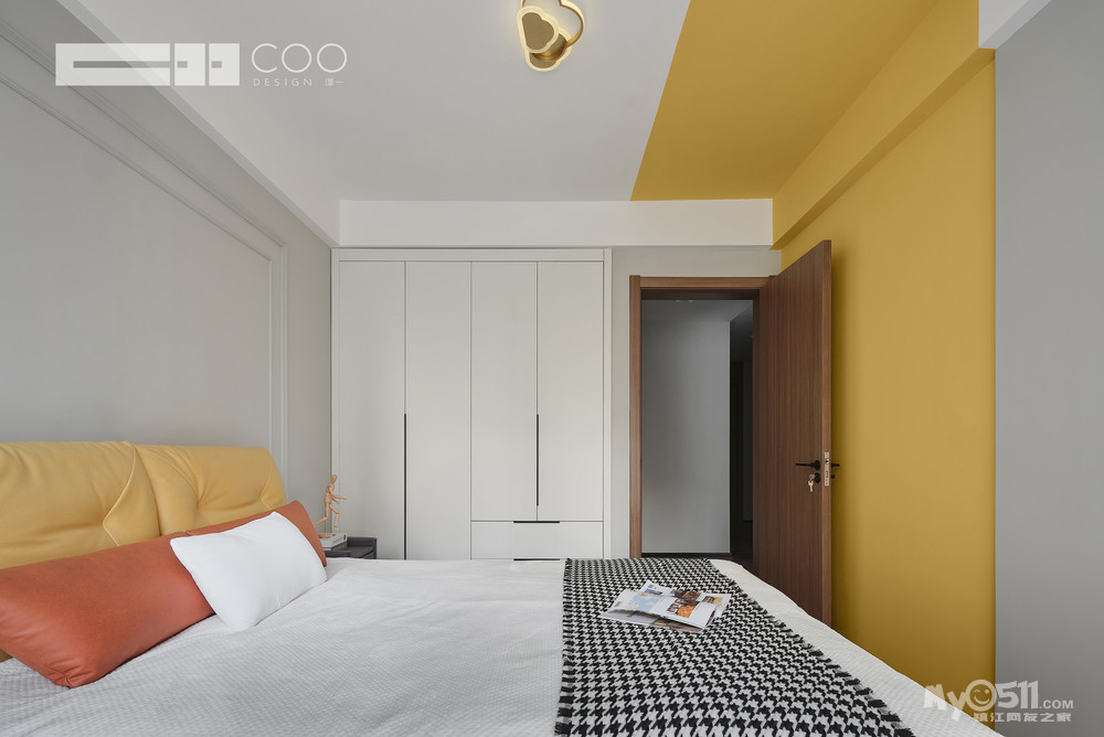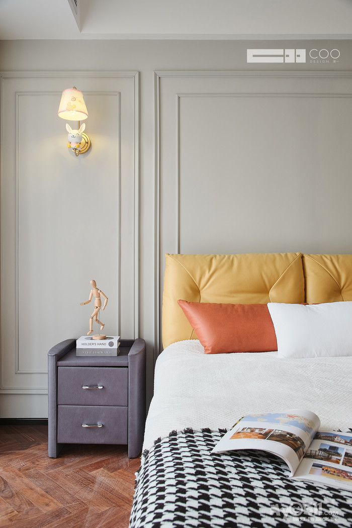 在床头及墙面处加入高饱和的黄,