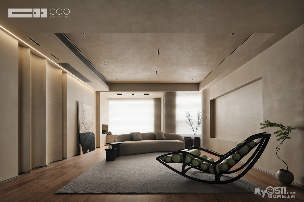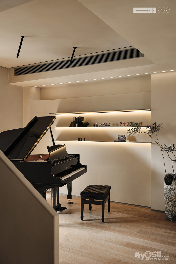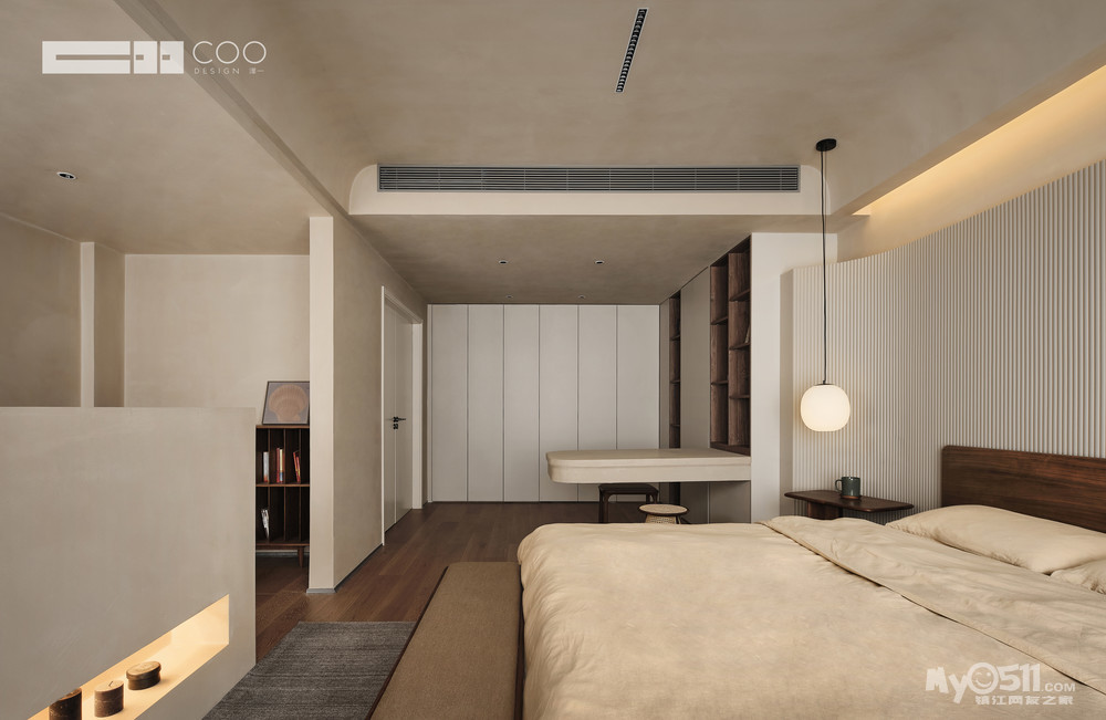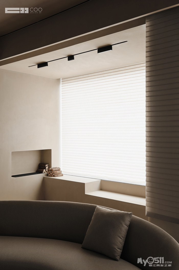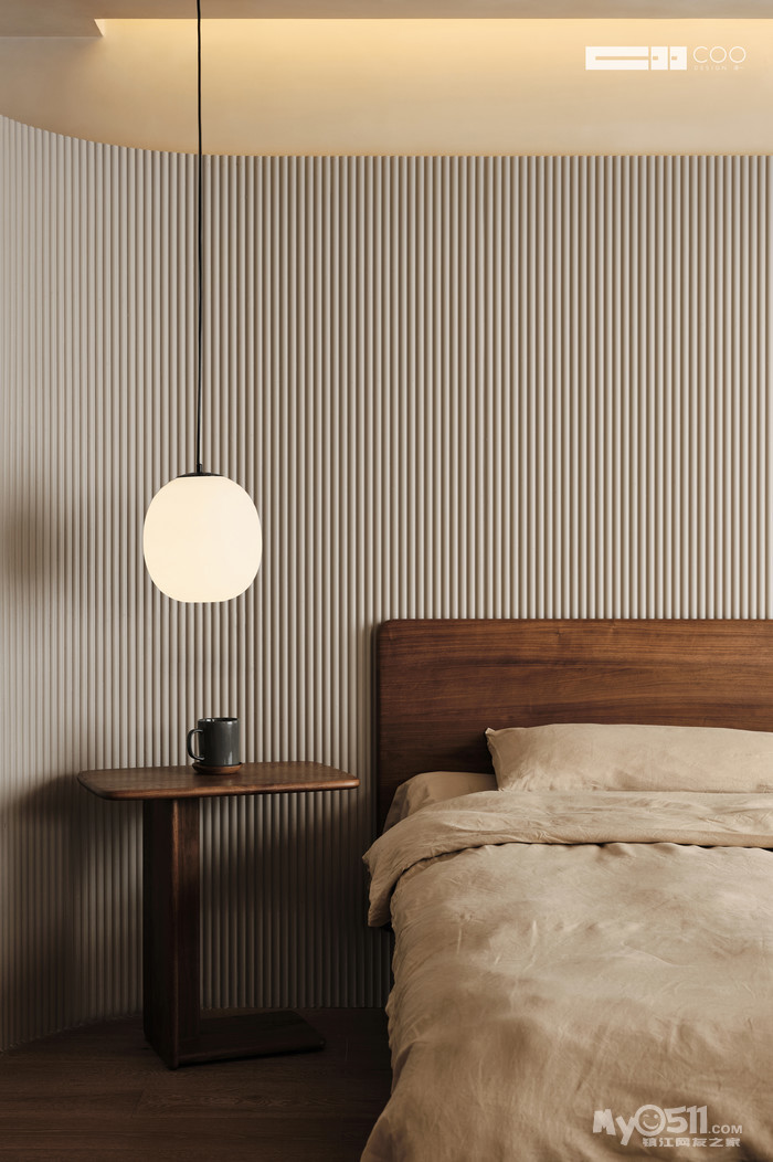 视线通过材质的过渡流转,流线型的墙面、温馨雅致的材质,人在其中,建立起“被包裹”的安全感。